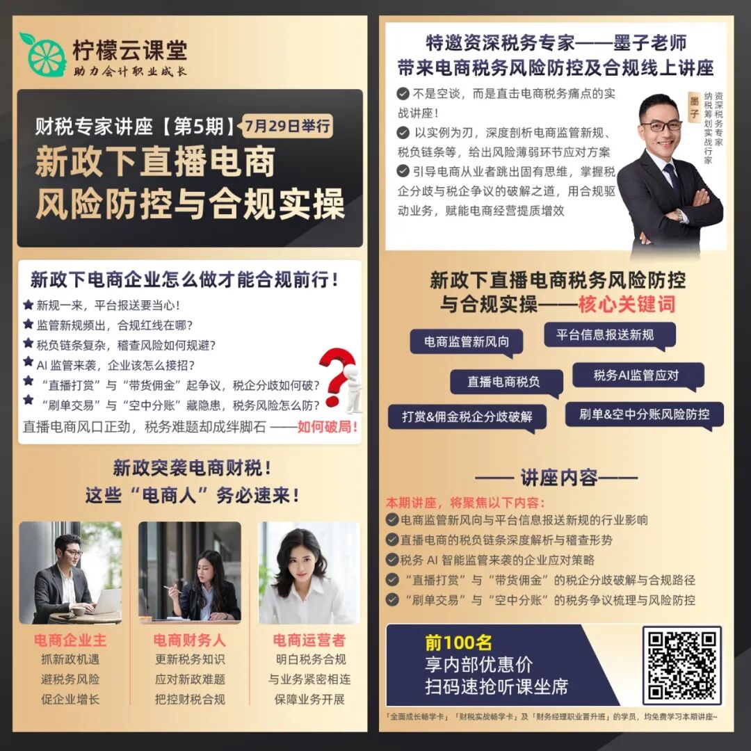 柠檬云课堂特邀资深税务专家墨子老师,为你带来一场 “新政下直播电商风险防控与合规实操” 的线上讲座,助你轻松应对这些难题!