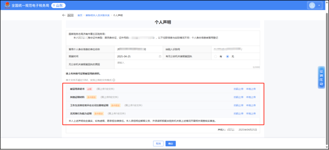 登录山东省电子税务局,点击“我要办税—综合信息报告—解除相关人员关联关系”,点击“解除关联”,选择“个人身份信息被冒用登记”,“有无公安机关接报案回执”选择“无”,系统展示相关要附列资料,如下图所示: