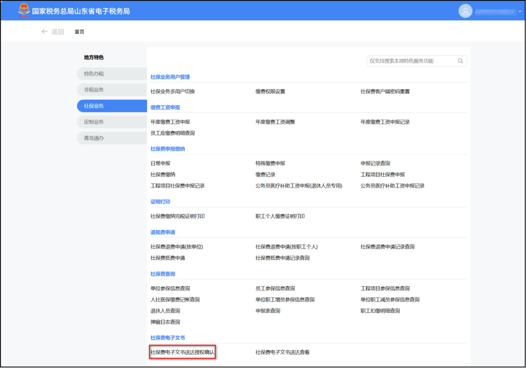 纳税人登录电子税务局,点击“地方特色—社保业务—社保费电子文书”模块,如下图所示: