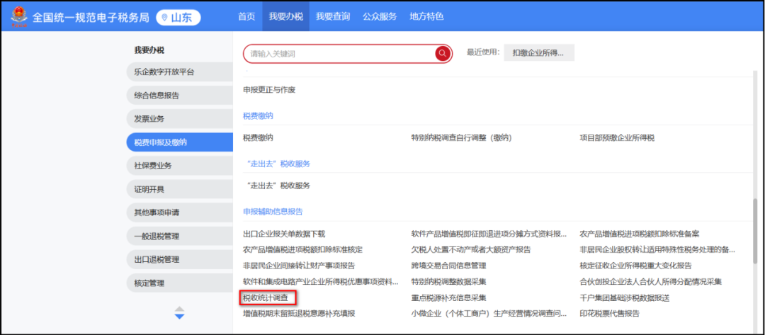 登录山东省电子税务局,点击“我要办税—税费申报及缴纳—税收统计调查”功能,如下图所示:
