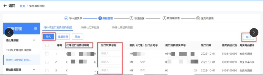 在数据管理环节,选择“代理出口货物证明待处理数据”模块,纳税人可通过“导入”“导出”按钮进行数据导入或导出。