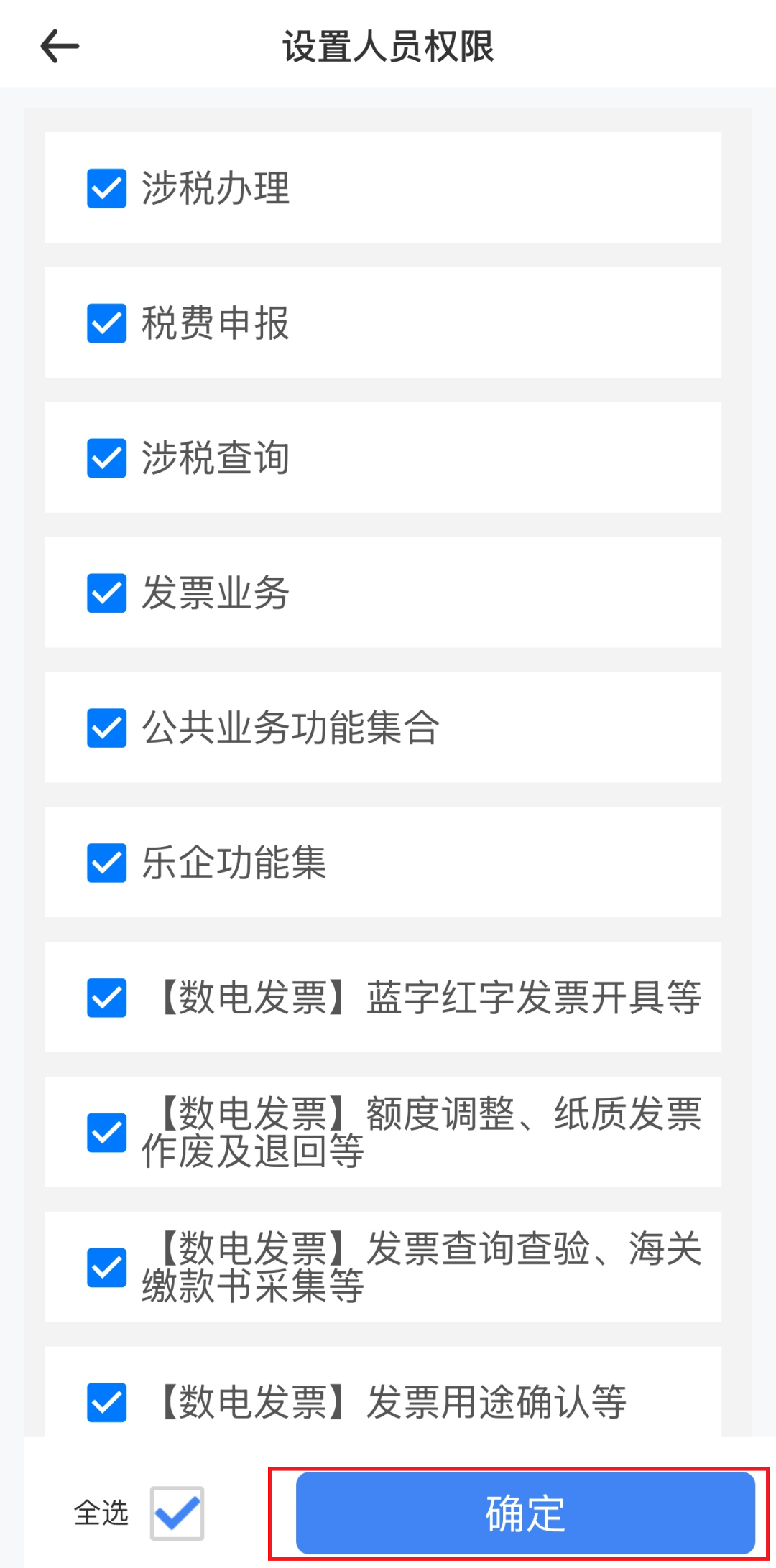 注意:在【人员权限】一栏,新添加办税人员默认勾选了【数电发票】五个功能集功能权限,法定代表人或财务负责人在新增人员时可通过点击【人员权限】栏次的右边【设置】,修改新增人员的权限配置,核实无误后点击【确定】。