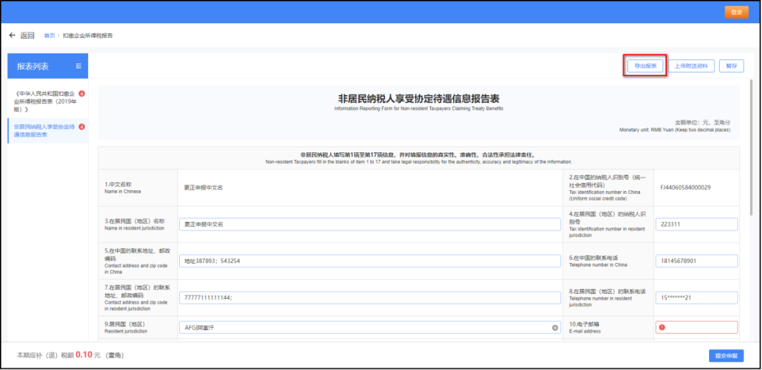 纳税人选择享受协定待遇,填写《非居民纳税人享受协定待遇信息报告表》,表单右上角增加“导出报表”功能按钮,如下图所示: