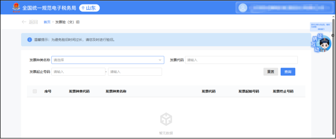 登录山东省电子税务局,点击“我要办税—发票业务—发票验(交)旧”功能,增加数电纸票,支持数电纸票的手工实时验旧,如下图所示: