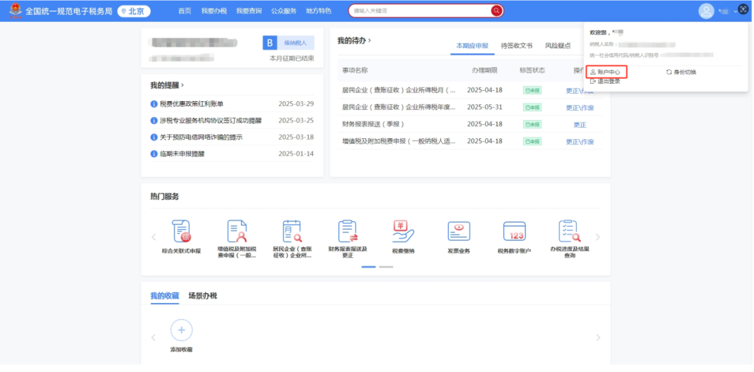 进入电子税务局页面后,右上角-【账户中心】,进入账户中心界面。