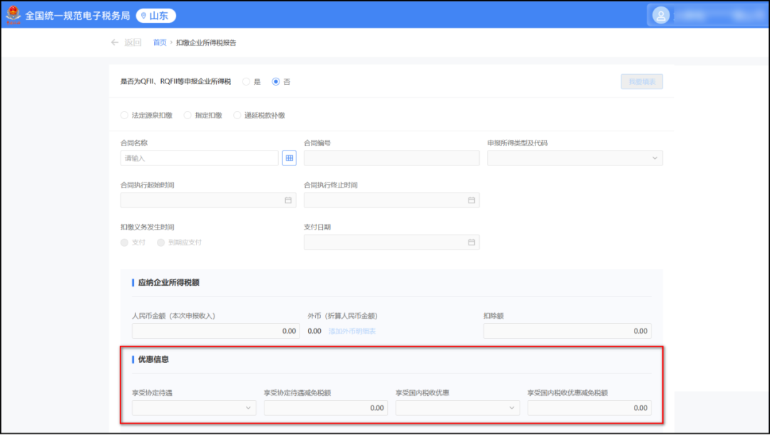 登录山东省电子税务局,点击“我要办税—税费申报及缴纳—扣缴企业所得税报告”,如下图所示: