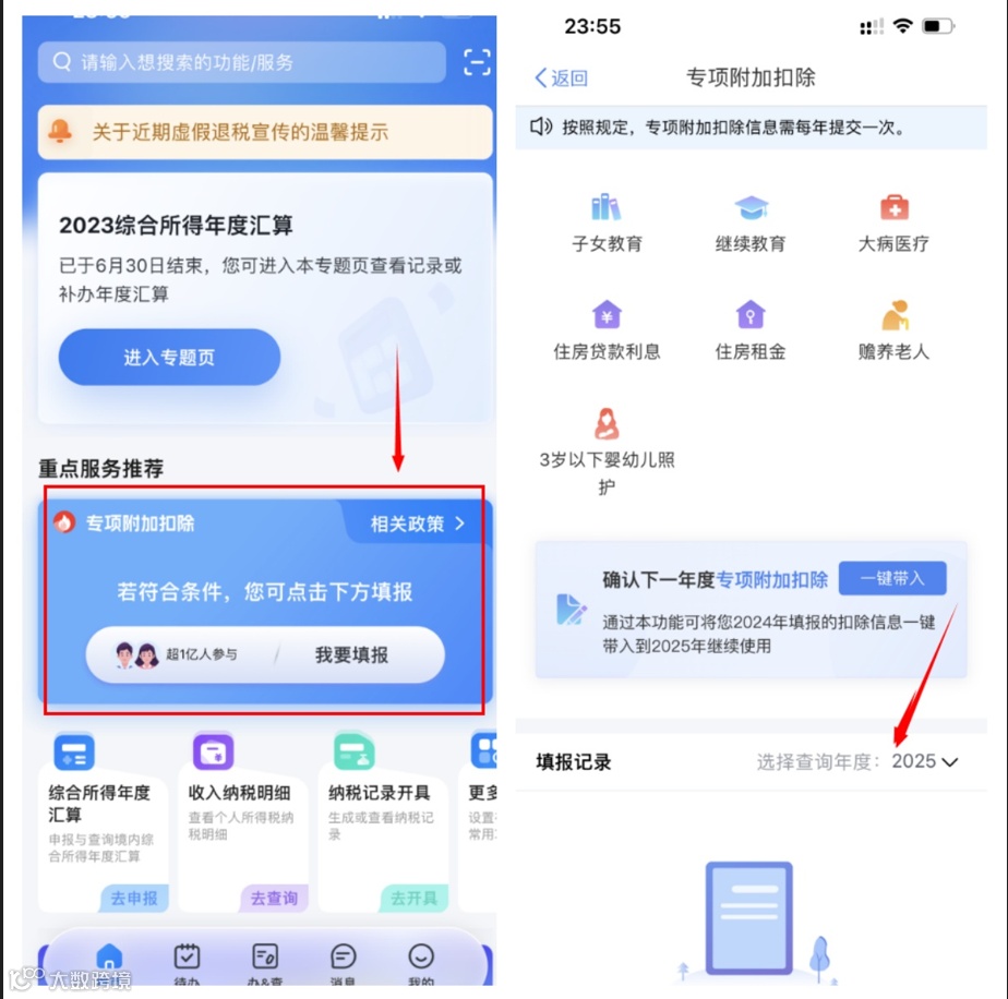 (1)点击【专项附加扣除填报】,进入填报页面。【填报记录】选择【查询年度2025年】。