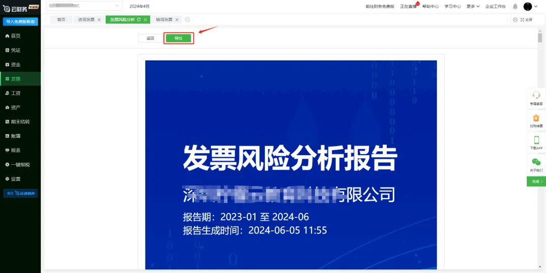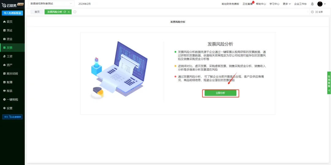 一、点击菜单栏【发票】-【发票风险分析】进入页面