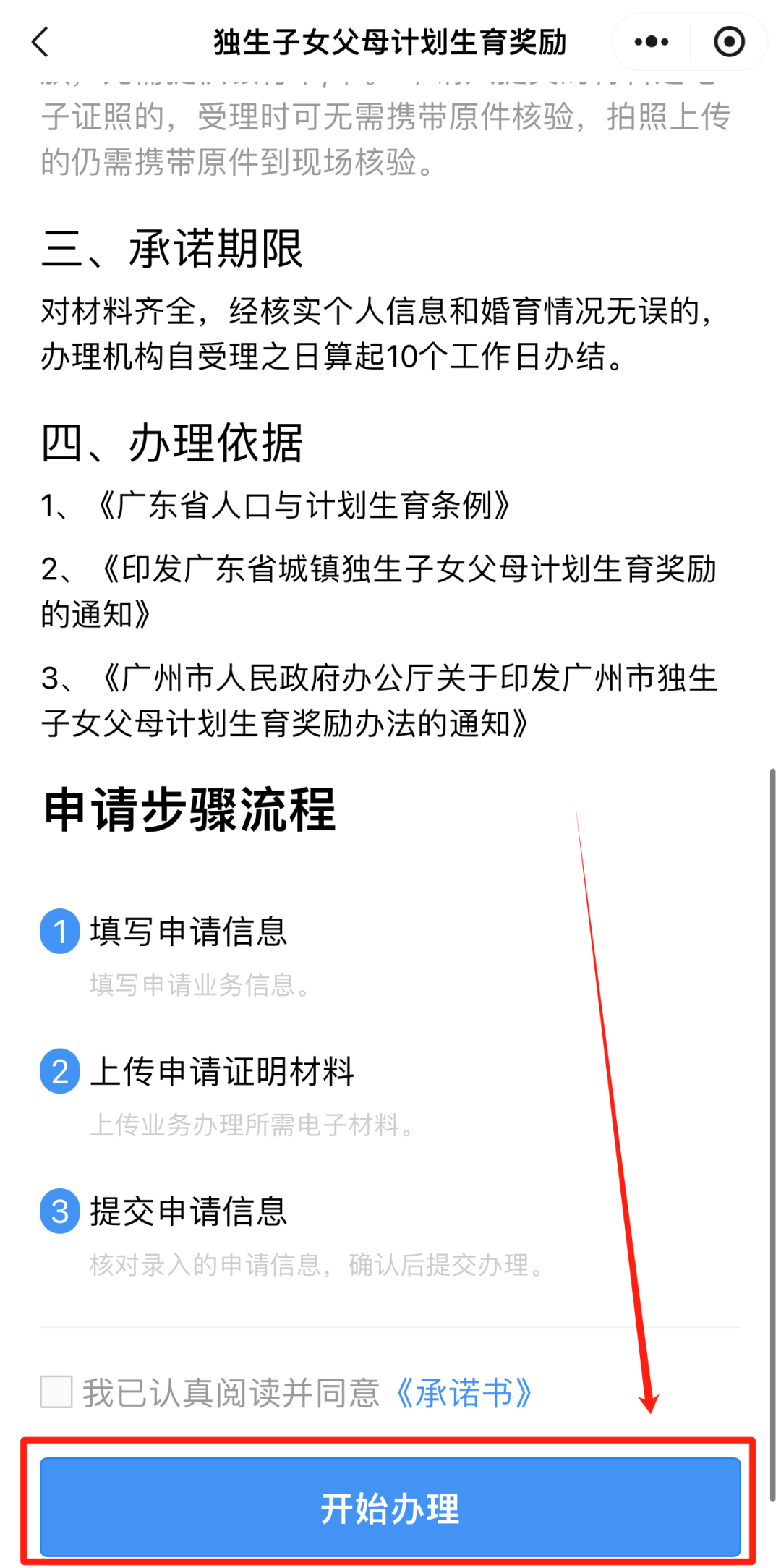 开始办理:点击“独生子女父母计划生育奖励”,阅读办事指南,勾选“我已认真阅读并同意《承诺书》”,点击“开始办理”;