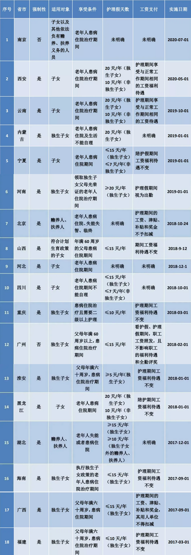 近年来,福建、广州、重庆、四川等多个地区陆续出台实施了独生子女父母护理假制度,给予独生子女每年累计10天至20天不等的带薪护理假,在其父母患病住院期间进行陪护。