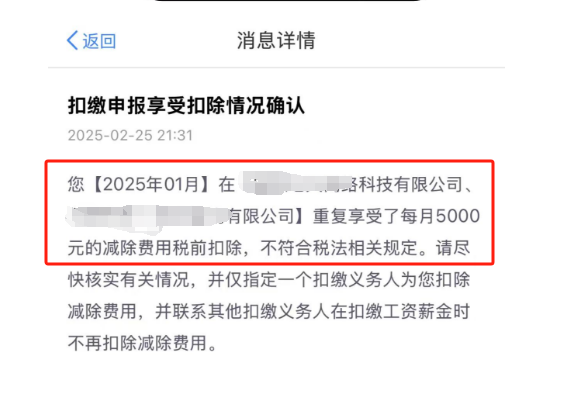 近期多地税局严查重复扣除基本减除费用,多个小伙伴收到税局消息提醒: