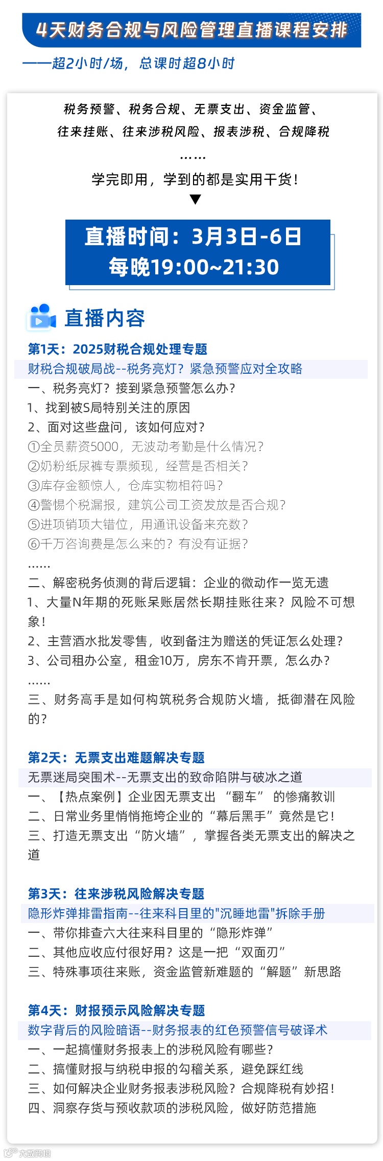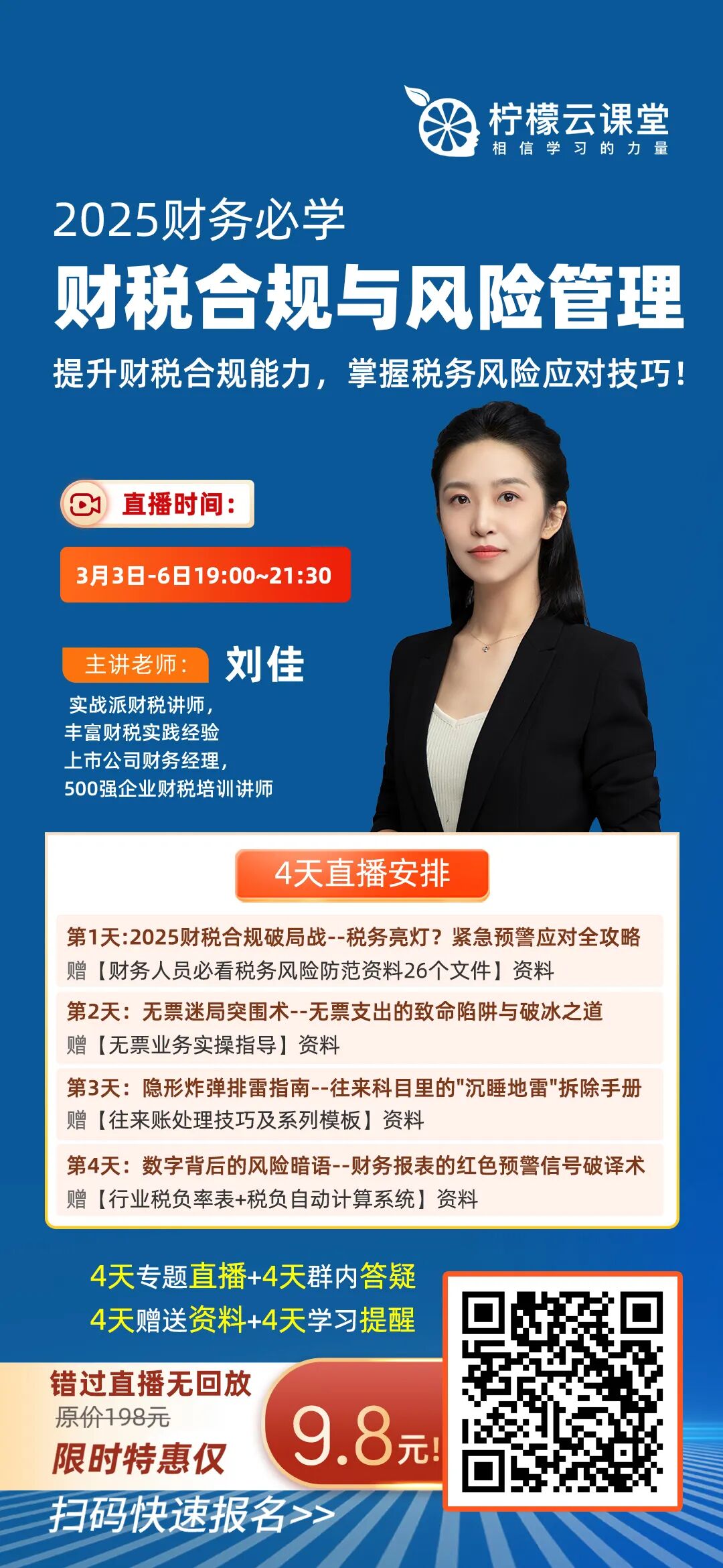 别发愁,好消息来了!由刘佳精心筹备的财税合规与风险管理 4 天直播特训将带你破局,找到应对之道!