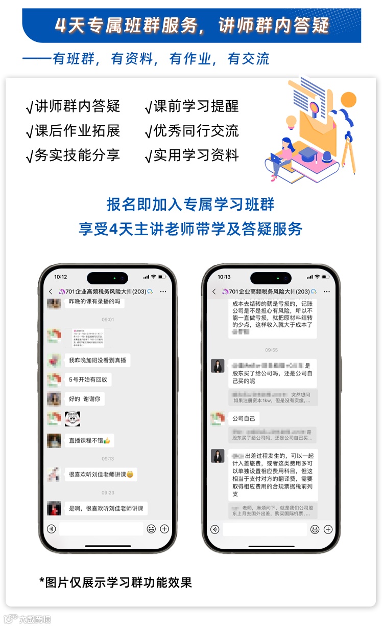 4天直播不只是教你学习热门税务风险的解决之道,更有4天群答疑服务,主讲老师就在群里和同学们互动沟通,辅导课程学习,解决学习难题!