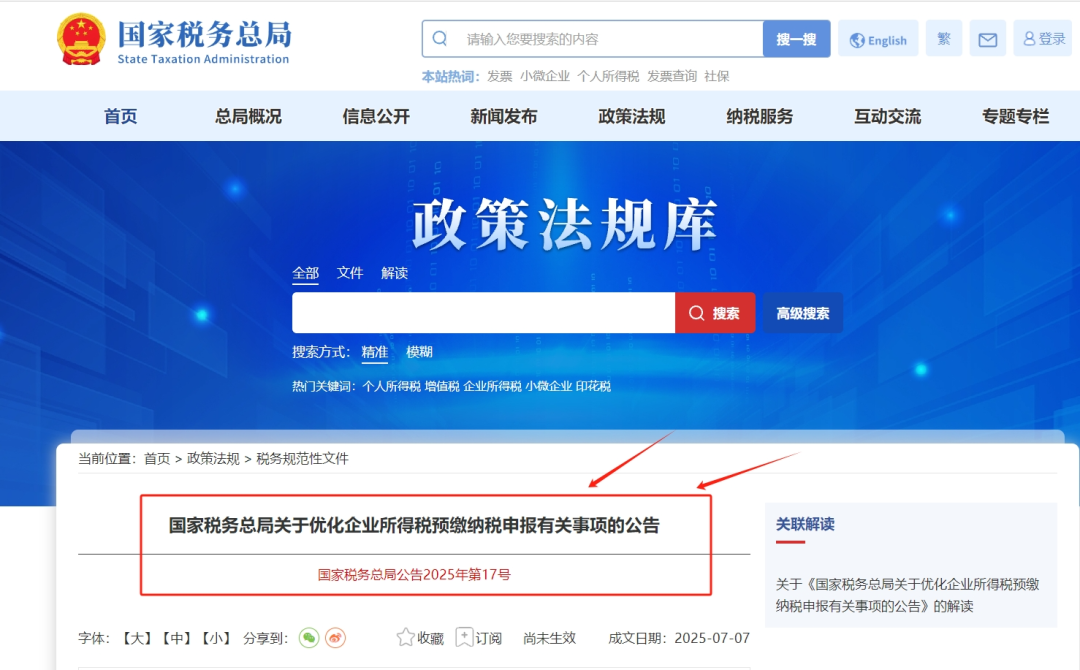 关于优化企业所得税预缴纳税申报有关事项的公告