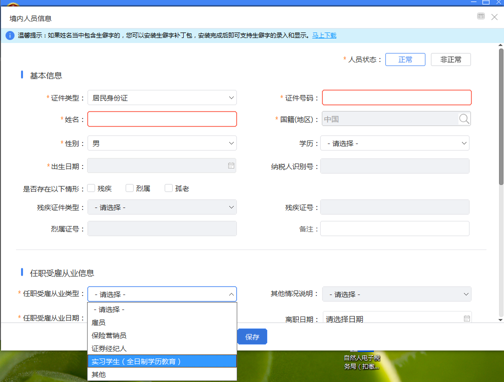1.登录后点击左侧菜单第一行【人员信息采集】——输入法定代表人(经营者)相关信息(身份证件号码、姓名、手机号码必填,任职受雇类型选择“其他”)——点击【保存】——点击【报送】。
