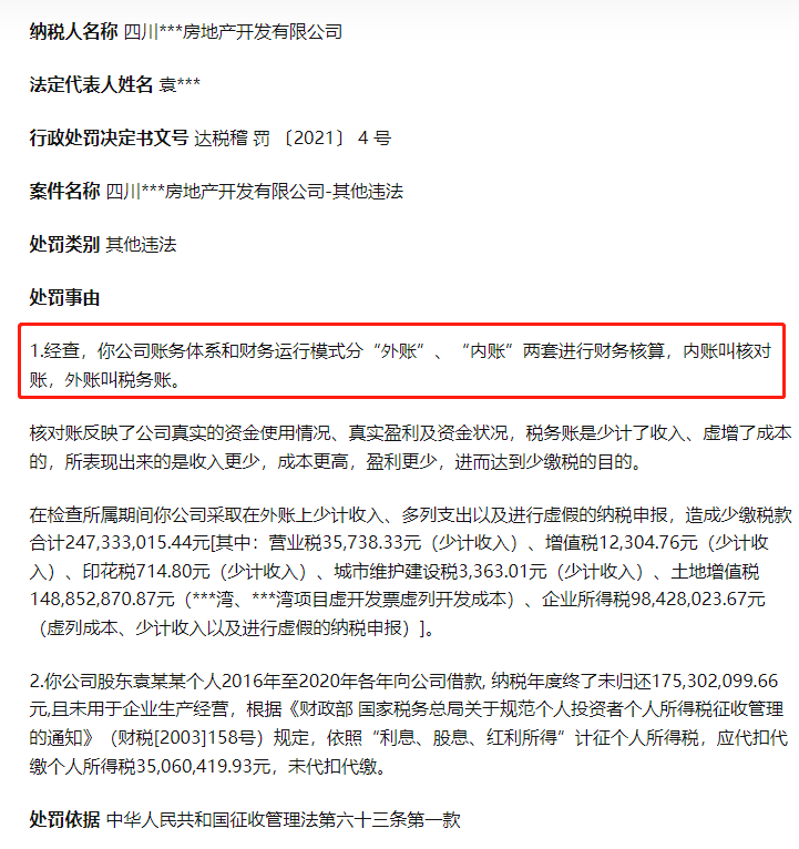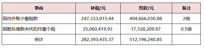 3、在外账上少计收入、多列支出以及进行虚假的纳税申报,造成少缴税款合计247,333,015.44元。