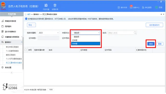 第二步:点击左侧菜单栏“集中申报一查询统计一员工汇算申报状态查询”,税款所属期选择“需要查询的汇算年度”,申报状态选择“未申报”,点击查询即可。