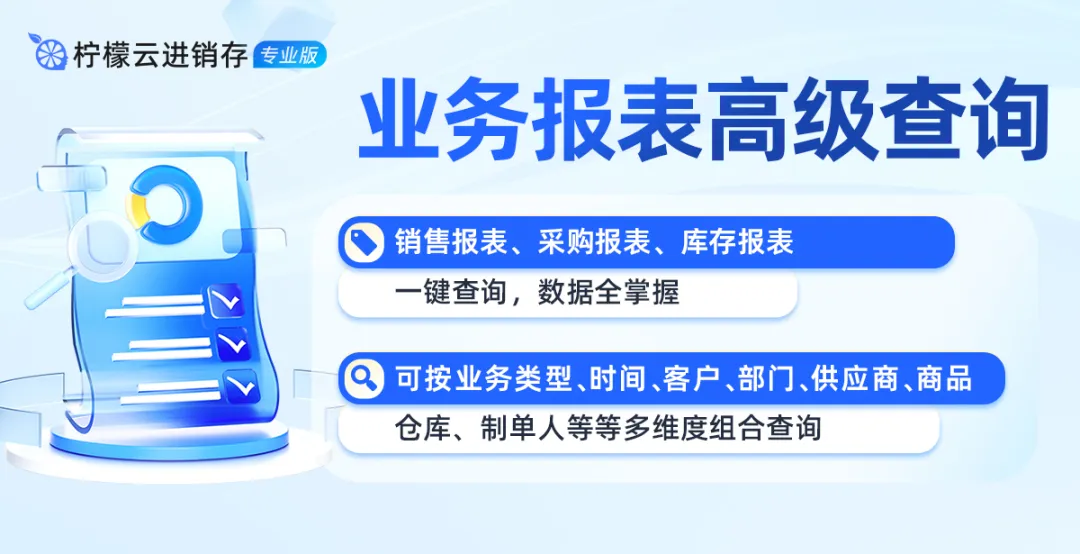 您可以按业务类型、自定义时间、客户、部门、供应商、商品、仓库、制单人等多维度组合查询各类业务报表,如销售报表、采购报表和资金报表等。