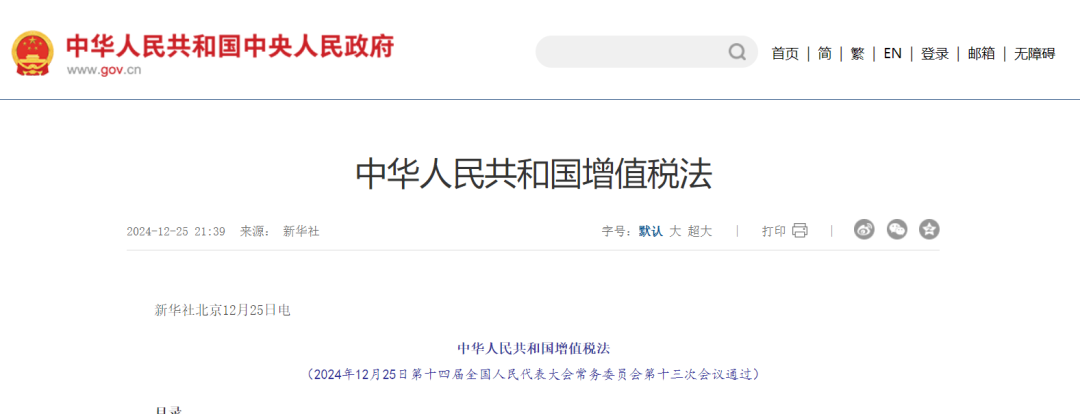 2024年12月25日,第十四届全国人民代表大会常务委员会第十三次会议通过了《中华人民共和国增值税法》,宣布自2026年1月1日起开始实施。