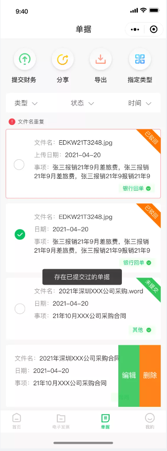 提交不成功的票据会使用红框进行标记,且票据左上角会体现感叹号及提醒内容:发票重复;文件名重复