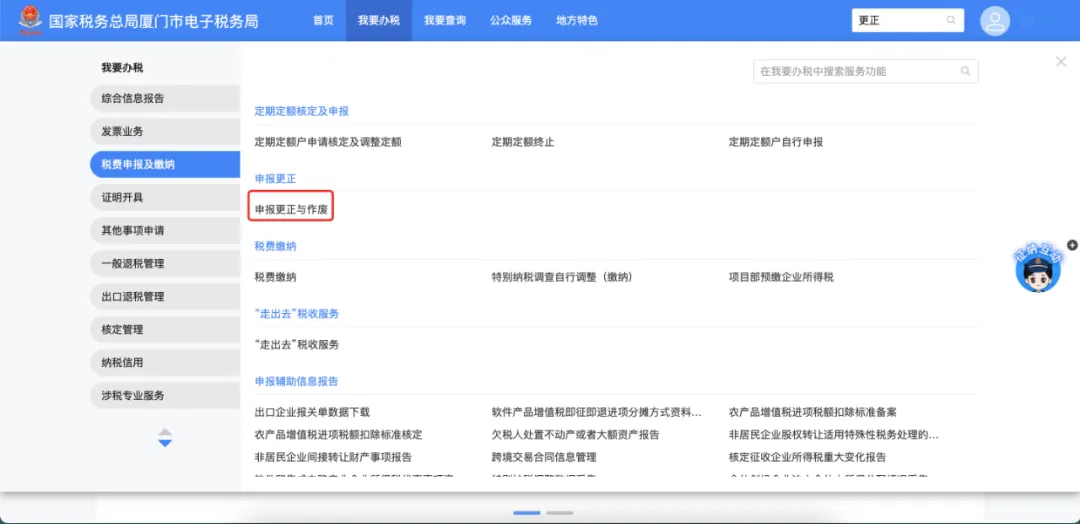 1、登录新电子税务局后,点击【我要办税】-【税费申报及缴纳】-【申报更正与作废】功能菜单。或者通过搜索栏搜索
