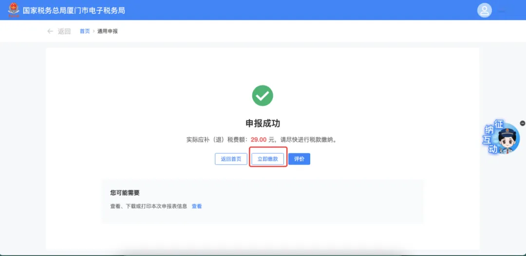 需注意的是:如更正后的应纳税款大于更正前的应纳税款,需点击“立即缴款”完成税款缴纳。