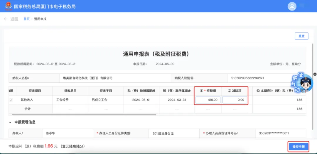 如更正后的应纳税款小于更正前的应纳税款,系统提示“实际应补(退)税额”为0。