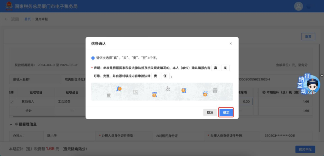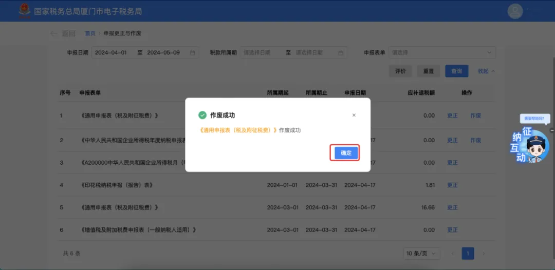 ①申报作废:点击作废,系统会跳出弹窗信息,进行确认后,点击确定,完成申报表作废。