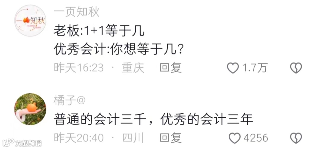 实际上会计专业“湿鞋”的概率,堪称第一。有网友常常调侃:普通的会计三千,优秀的会计三年,老板问你“一加一等于几”,普通的会计会说等于二,而优秀的会计会反问“你想等于几”。