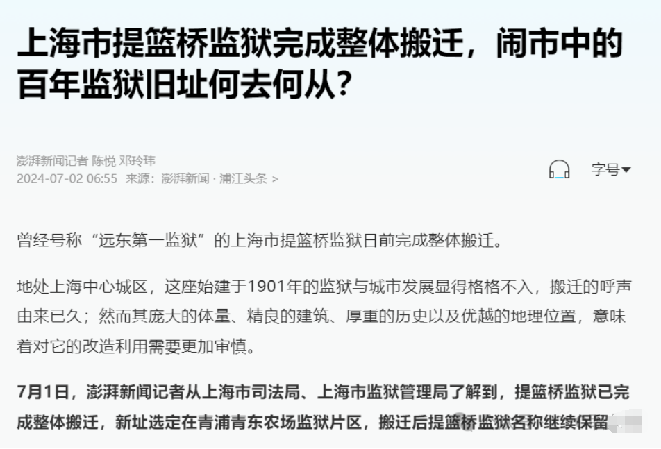 据澎湃新闻2024年7月2日报道,上海市提篮桥监狱日前完成整体搬迁,新址选定在青浦青东农场监狱片区,搬迁后提篮桥监狱名称继续保留。