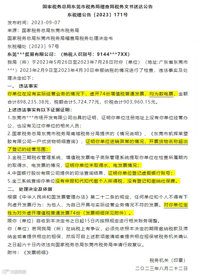 在国家税务总局广东省东莞市税务局的一则稽查报告显示:某公司超经营范围开具数电票90万元被处罚。