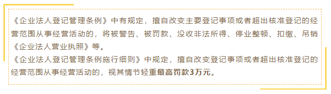 《企业法人登记管理条例施行细则》中规定,擅自改变登记事项或者超出核准登记的经营范围从事经营活动的,视其情节轻重最高罚款3万元。