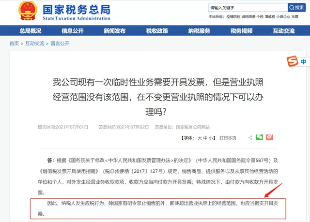 其实,国家税务总局早就对超出经营范围是否能够开发票进行了明确回复,可以查看下图。