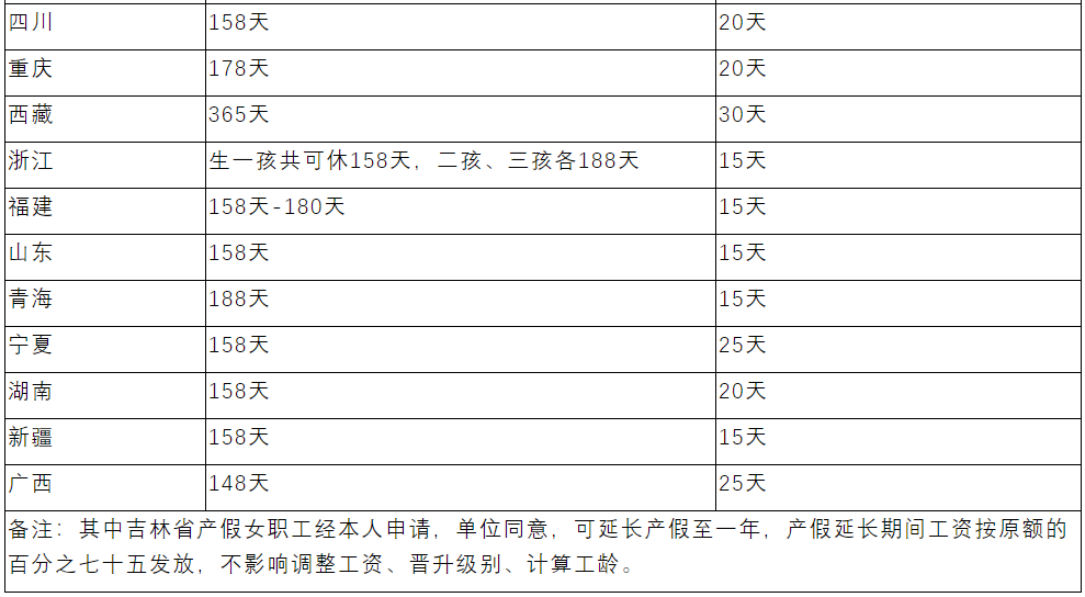 随着各地计生条例的修改,产假有所延长,具体可查看下表: