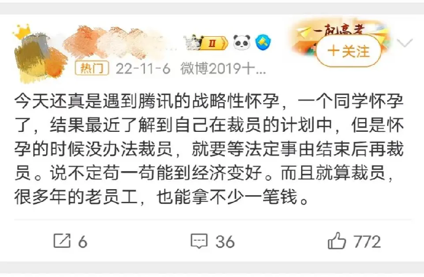 某大厂女员工本来都要被公司裁了,但又因查出怀孕被剔除裁员名单了,她表示心情很复杂,不知道是该高兴还是该悲伤。