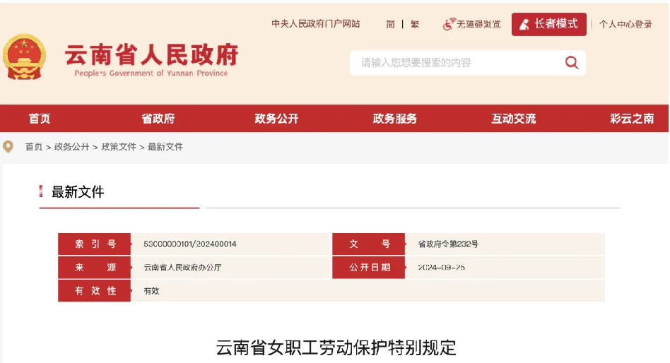 《云南省女职工劳动保护特别规定》已经2024年9月3日第十四届云南省人民政府第39次常务会议审议通过,并于近期正式公布,该《规定》自2024年11月1日起正式执行!