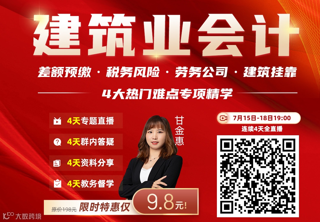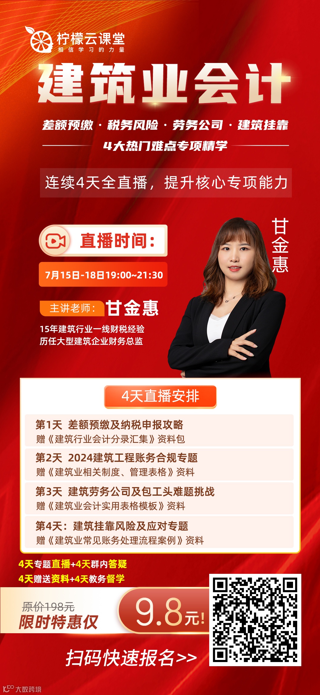 在课上,甘老师将带你深入学习建筑业异地预缴填报等常见疑难处理技巧、建筑劳务公司人、料、票等的处理及工程账务合规,暂估成本、虚增成本等热门稽查趋势以及挂靠、利润提取等等干货内容!