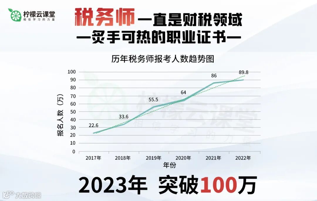 2023年税务师考试报名人数发布后,我们可以看出从2017年至2022年税务师考试报名人数一直飞速增长,2023年税务师考试报名人数突破100万。