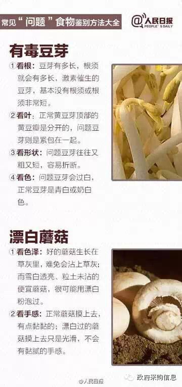 近日,内蒙古警方收缴并销毁近5吨毒豆芽,其中添加的无根剂、AB粉等,食用过多可能致癌。雪白的蘑菇、无根的豆芽、鲜红的枸杞……"问题"食物大多鲜艳诱人,却有害身体。戳图,15种常见问题食品,手把手教你揪出来!收藏!转发给你关心的人。
