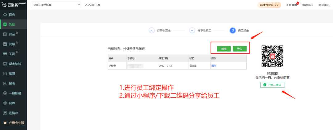 2、进入【柠檬云财务】软件里面,点左边菜单:凭证—>收票宝,然后一步步根据提示来绑定员工(就是需要来交票给财务的公司员工,为了方便可以把全公司的员工都绑了)