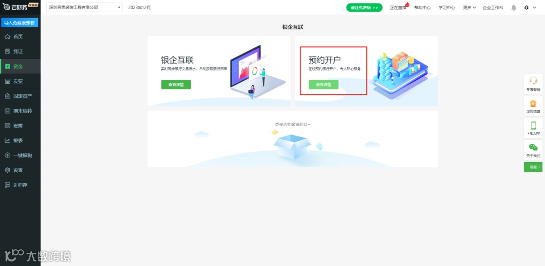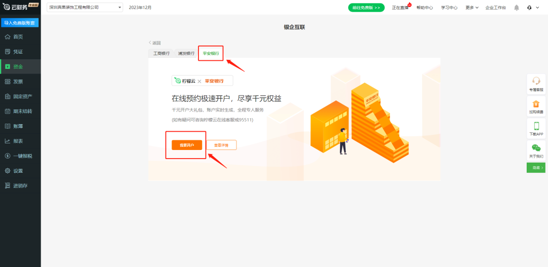 4. 如果您没有平安银行账户,需在柠檬云财务软件下方预约开通平安银行账户,开通账户后再按以上步骤完成平安银行银企互联的签约即可