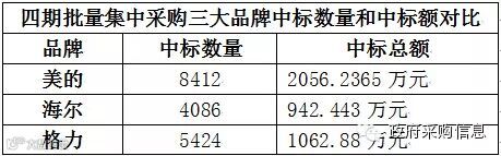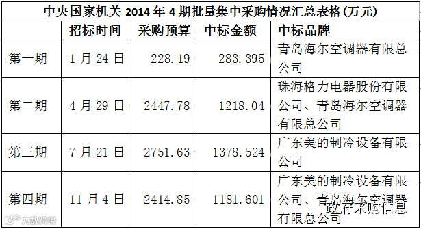 这意味着从2014年1月到今年11月为止,中央国家机关政府采购中心(以下简称"国采中心")组织的空调批量集中采购收官,美的以中标8412台,中标额2056.2365万元夺魁,中标金额超过珠海格力电器股份有限公司和海尔总和。