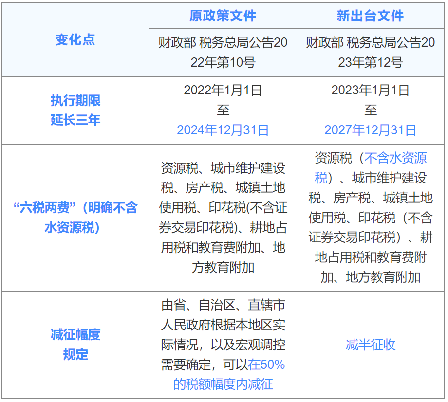 财政部、国家税务总局发布的《关于进一步支持小微企业和个体工商户发展有关税费政策的公告》(以下简称《公告》)中,小微企业“六税两费”减免政策除了执行期限有变化外,政策规定也有变化。