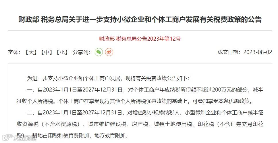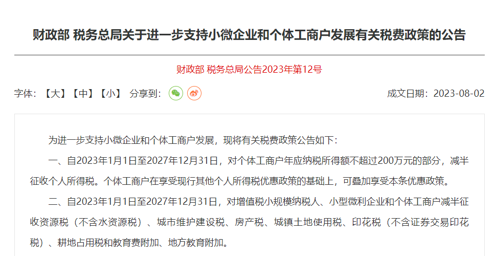 答:自2023年1月1日至2027年12月31日,对增值税小规模纳税人、小型微利企业和个体工商户减半征收资源税(不含水资源税)、城市维护建设税、房产税、城镇土地使用税、印花税(不含证券交易印花税)、耕地占用税和教育费附加、地方教育附加。