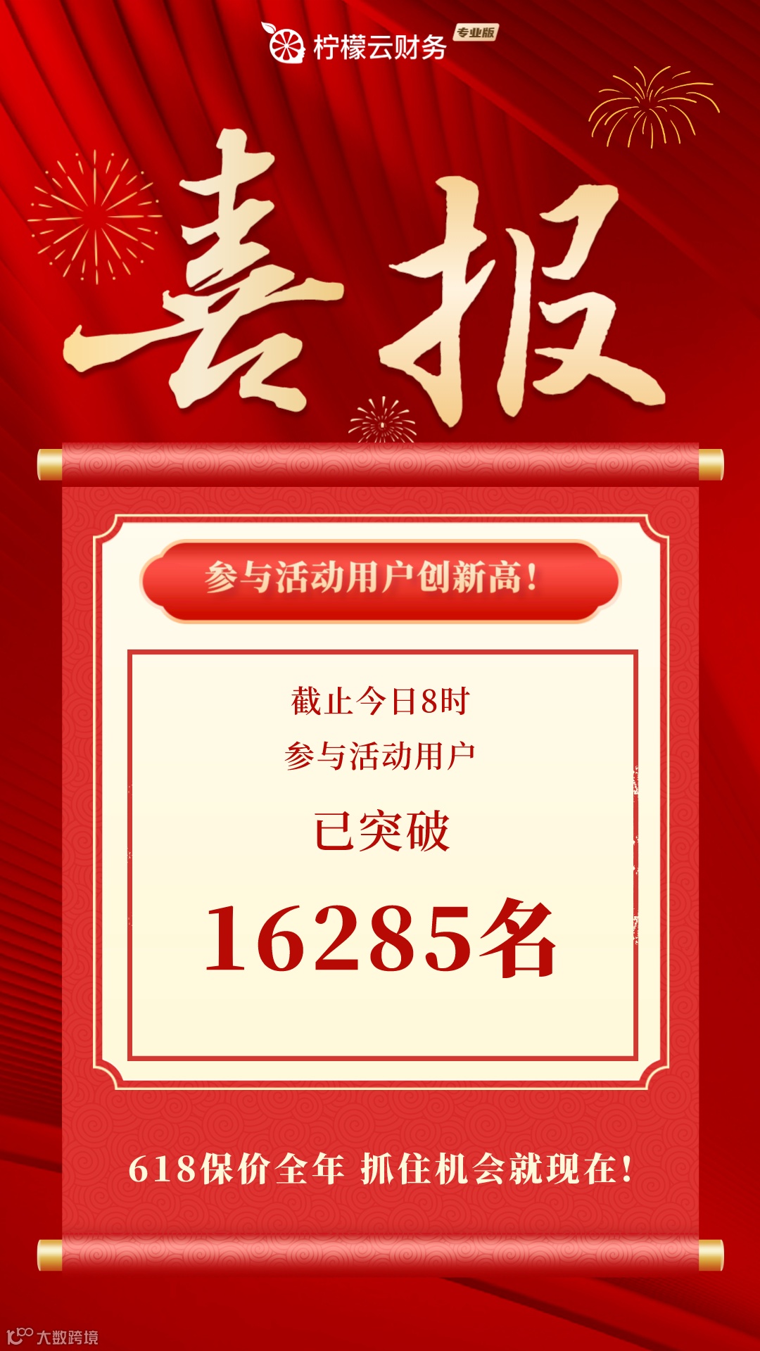 柠檬云财务「618钜惠狂欢」活动自6月5日开启以来,截止至今日8:00,短短一周,已有16285人参与活动购买/续费!