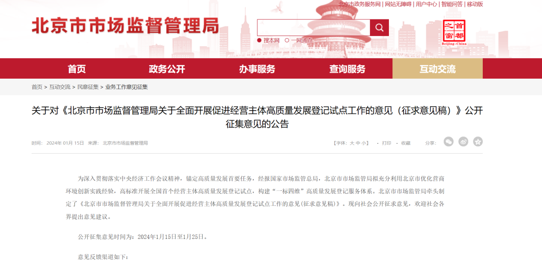 近日,北京市市场监管总局发布了《关于全面开展促进经营主体高质量发展登记试点工作的意见(征求意见稿)》。