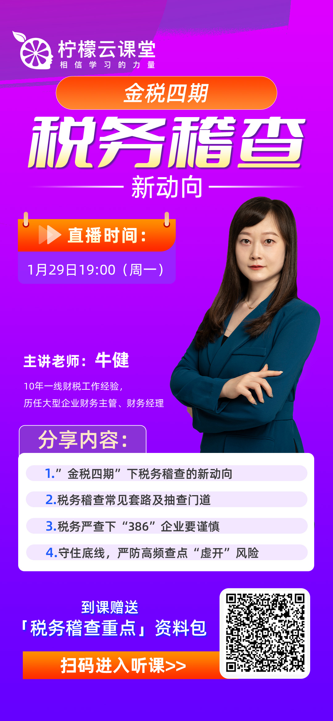 金牌实战讲师牛健老师将在直播课上为你深入解密税务稽查重点、税务稽查方向等热门问题,以案例说方法,以情景复原重现实际操作,横扫你的税务稽查相关疑惑!