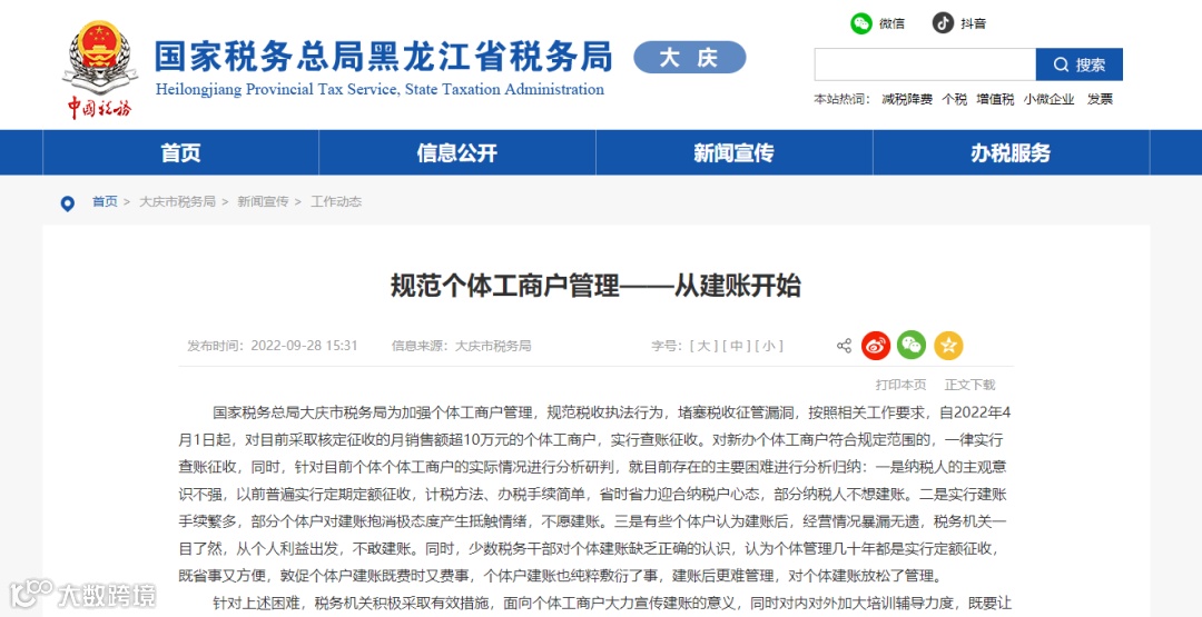9月28日,国家税务总局大庆市税务局发布,自2022年4月1日起,对目前采取核定征收的月销售额超10万元的个体工商户,实行查账征收。对新办个体工商户符合规定范围的,一律实行查账征收。