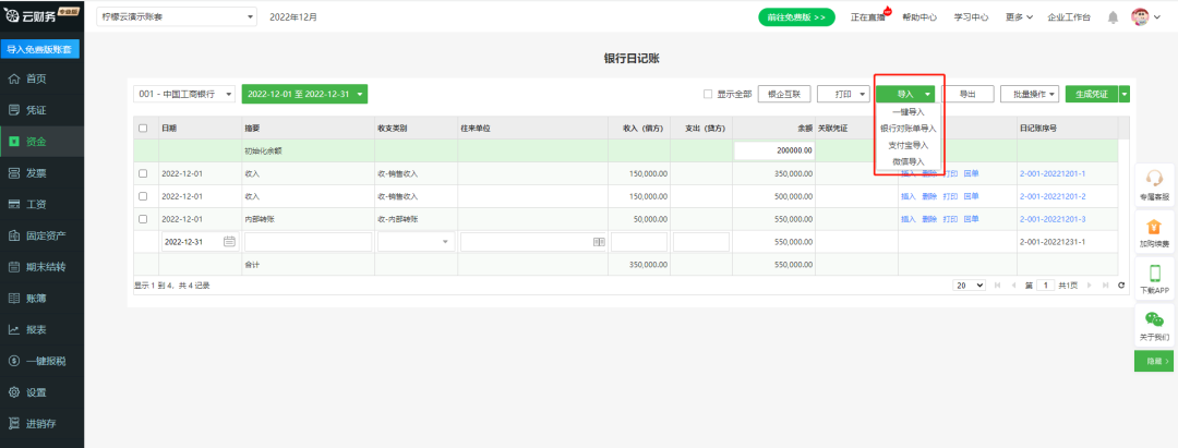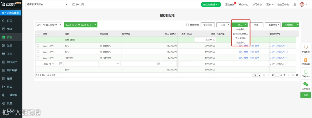如果你的账户所属银行在使用柠檬云财务软件系统中还未实现银企互联功能,可以在银行日记账中使用对账单、支付宝、微信、银行流水一键导入,勾选流水数据就能自动生成凭证,让财务人员省时更省心!