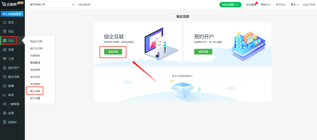 1.点击【资金】-【银企互联】进入或点击【资金】-【银行日记账】-【银企互联】也可进入